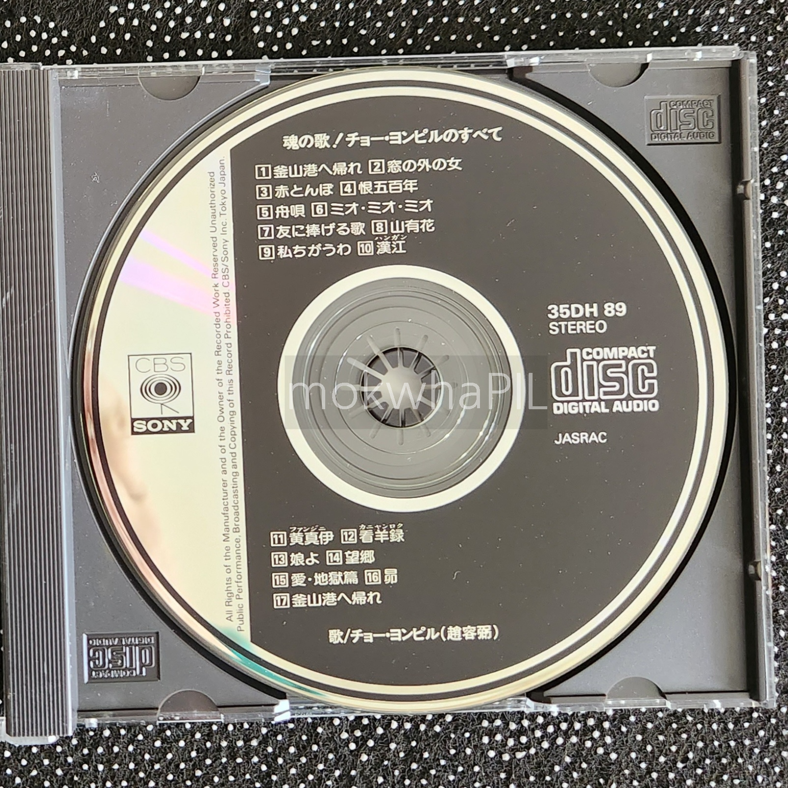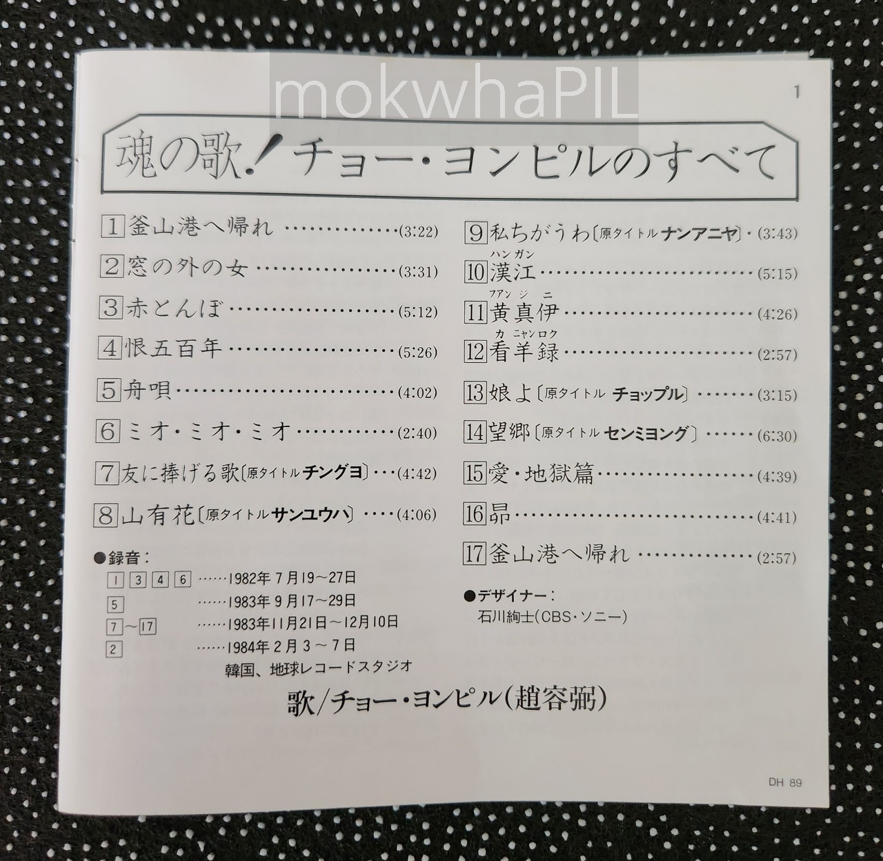 1번과 17번이 <돌아와요 부산항에>인데, 1번은 1982년 일본 데뷔 앨범 버전이고, 17번은 그 이후 1984년에 발표한 앨범 <친구에게 바치는 노래> LP의 재녹음 버전이다. 15번 째 곡 <愛·地獄篇·· 사랑·지옥편...>이 <비련>의 일어 버전이고, 타니무라 신지가 일어 가사를 썼다.