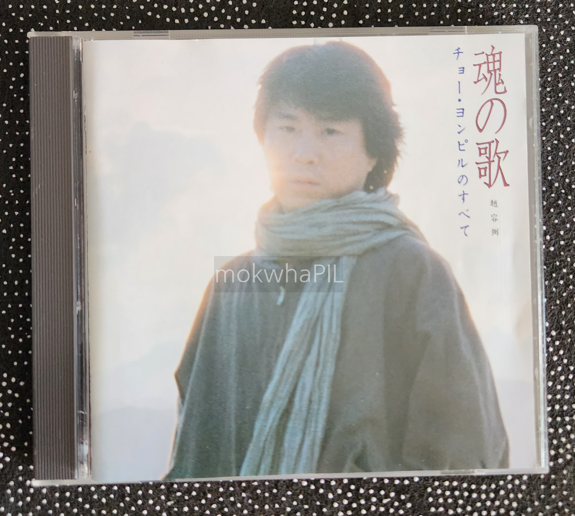 - <魂の歌 혼의 노래> CD 앞면. 뭔가 좀 아련한 분위기이다. 머리 모양, 목도리 등의 스타일을 보면 아마도 1982년에 <흔적> 화보를 찍을 때 촬영된 것 중 하나인 것 같다. 'チョー·ヨンピルのすべて 조용필의 모든 것'이라는 표기가 있다.